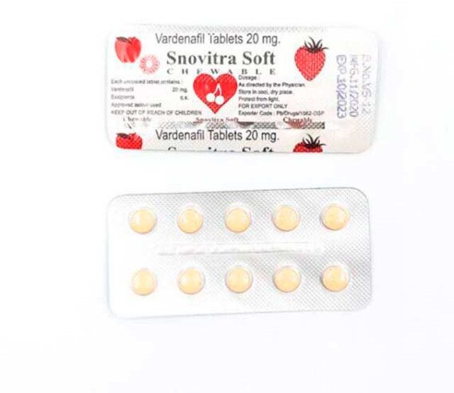 Snovitra Soft 20mg is a chewable Medicine that is used to treat ED in men by making use of Vardenafil 20mg that improves libido and sexual function in the penis thereby promoting firm erections that can be sustained without having to consume poor flavoured tablets and pills. The Medicine is manufactured by RSM Multilink LLP.